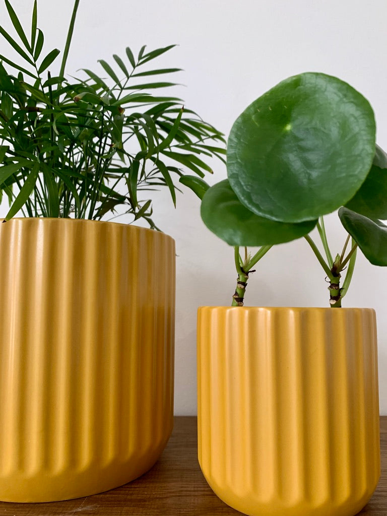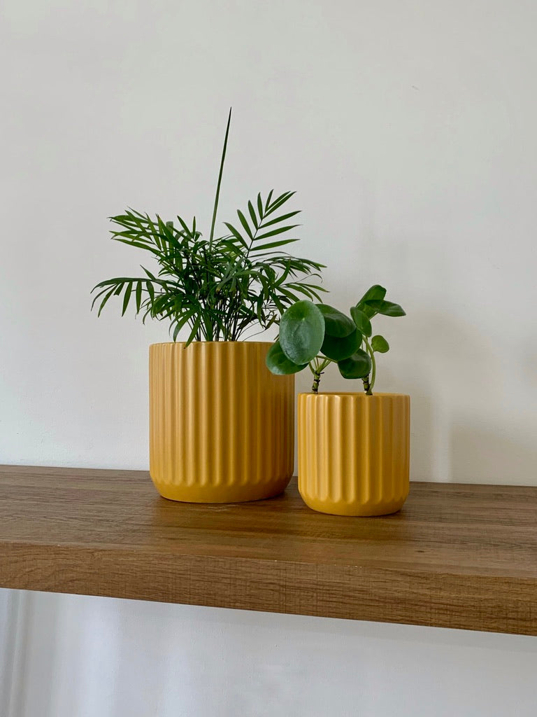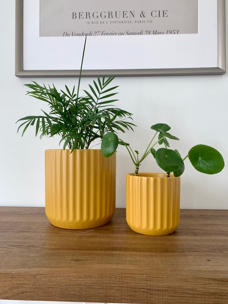A textured lines exterior makes these pots the perfect addition to any minimalistic space. Add a pop of muted color with burnt orange.