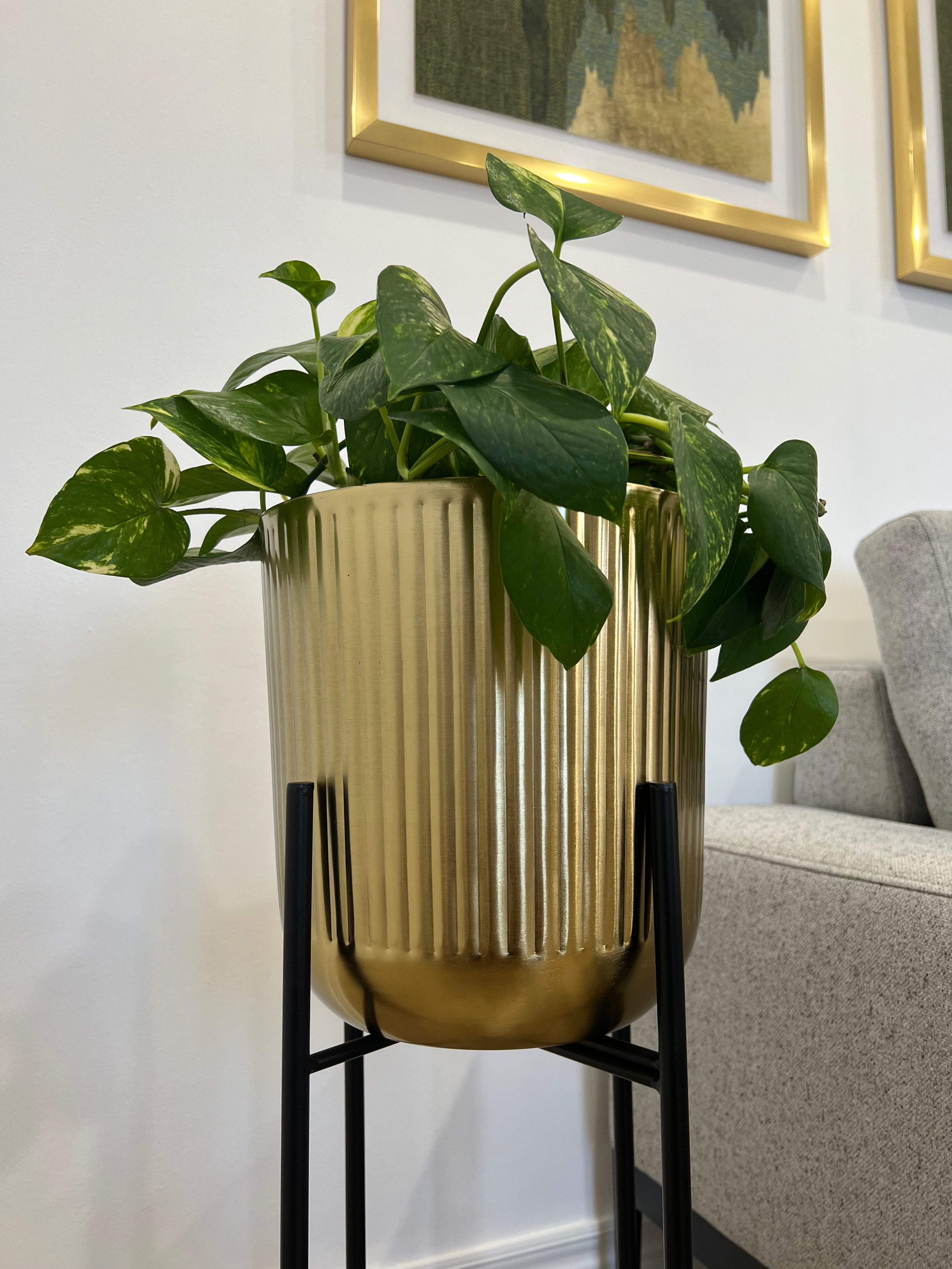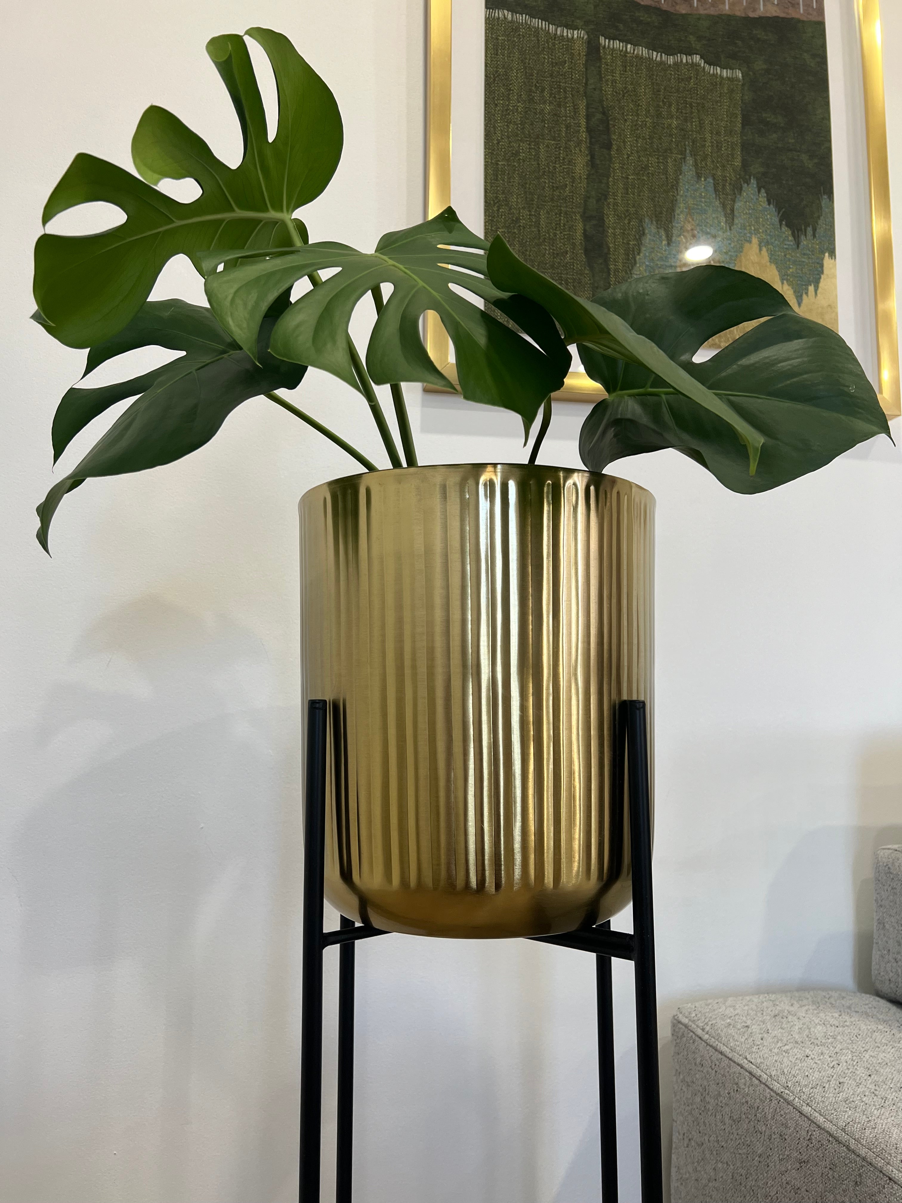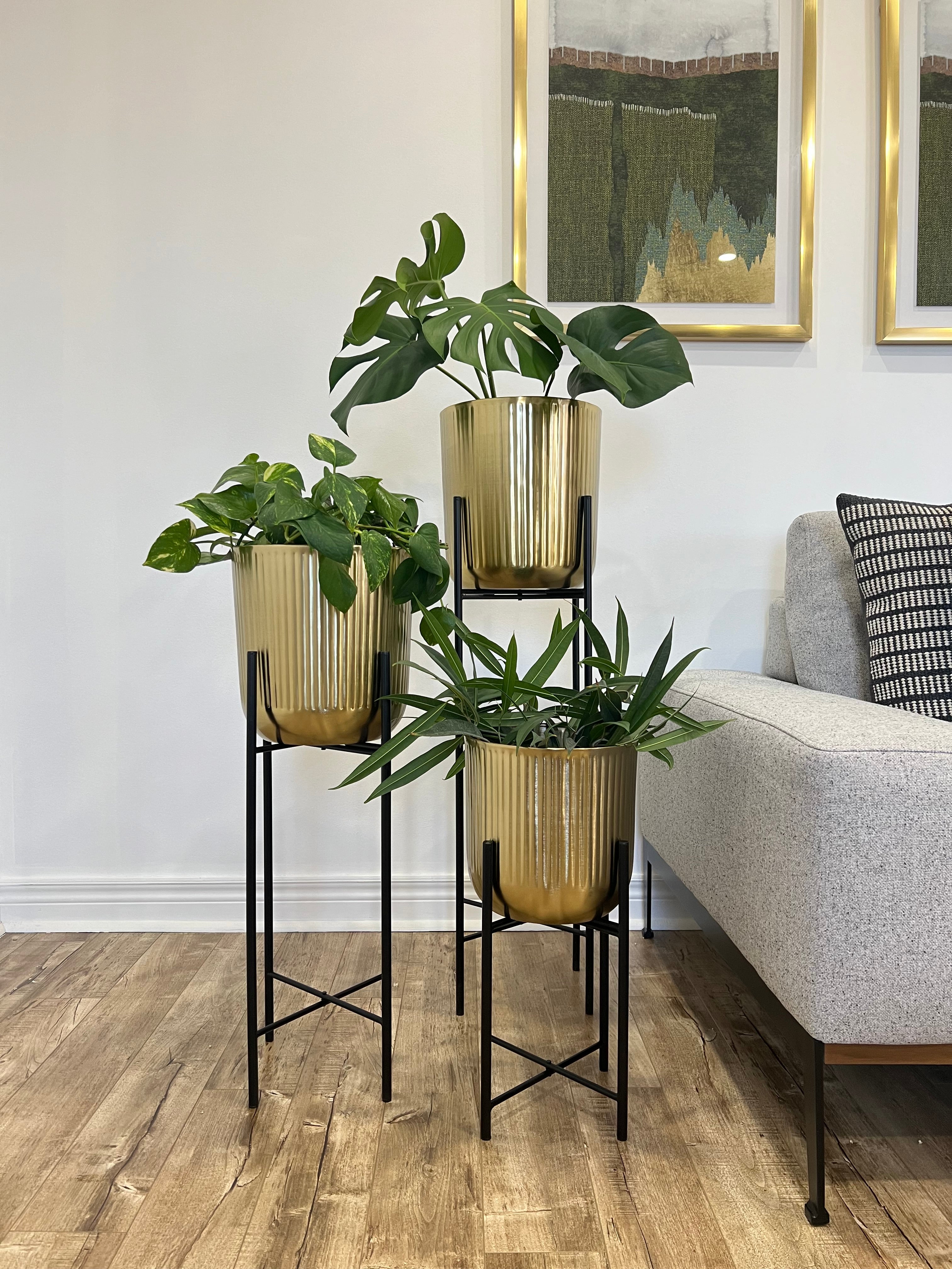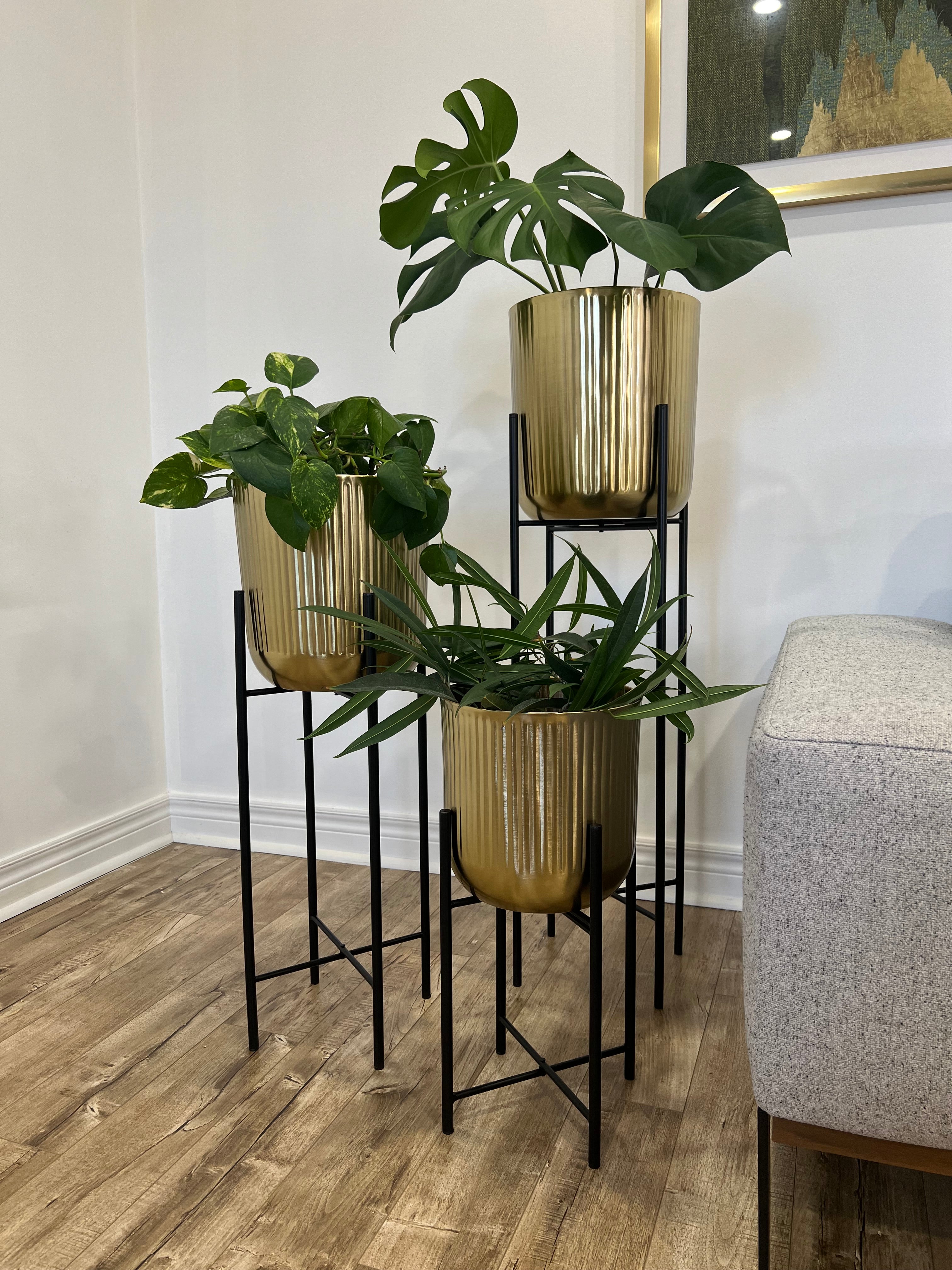 Gold, gold, and gold! A combination of luxury and modern makeup these curated pieces. Incorporate these muted gold bowls on sturdy iron legs into any space to add warmth. Made of 100% metal, they are the perfect everlasting purchase for your plants.