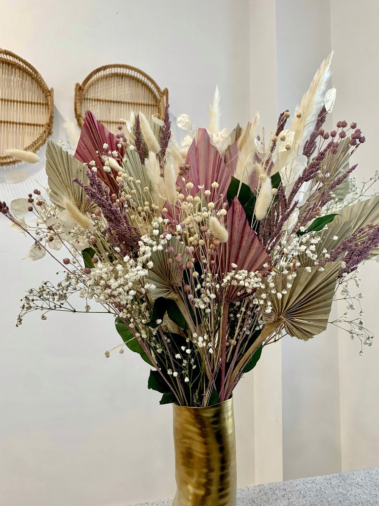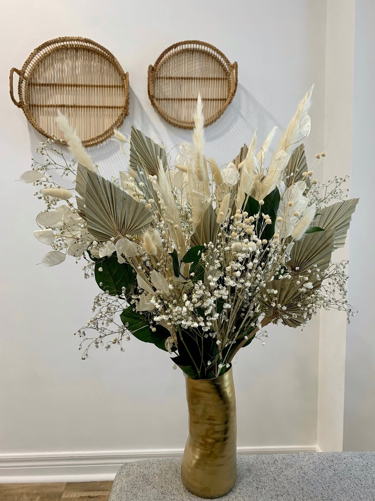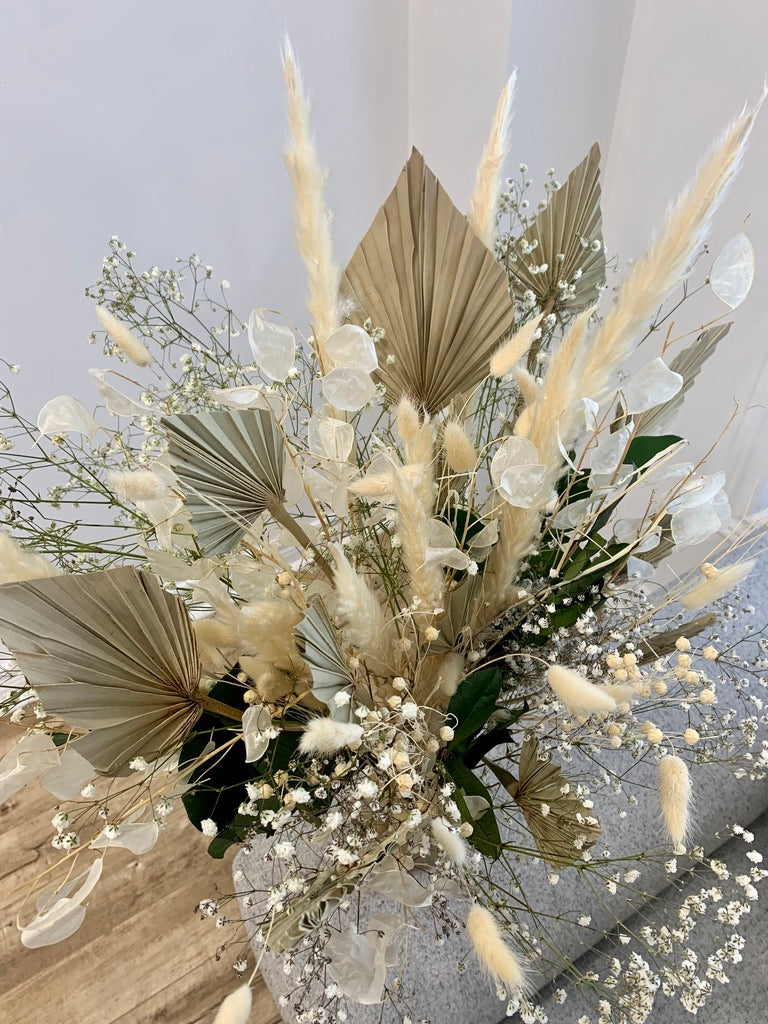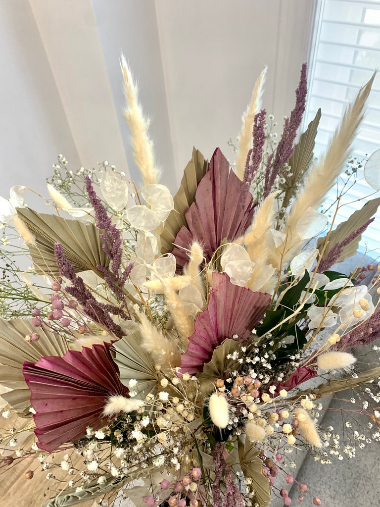 Palm Spears, Pampas, Baby's Breath (Gypsophila), Bunny's Tails, Lunaria Honesty, Flax Grass, Salal Preserved, Lavender.