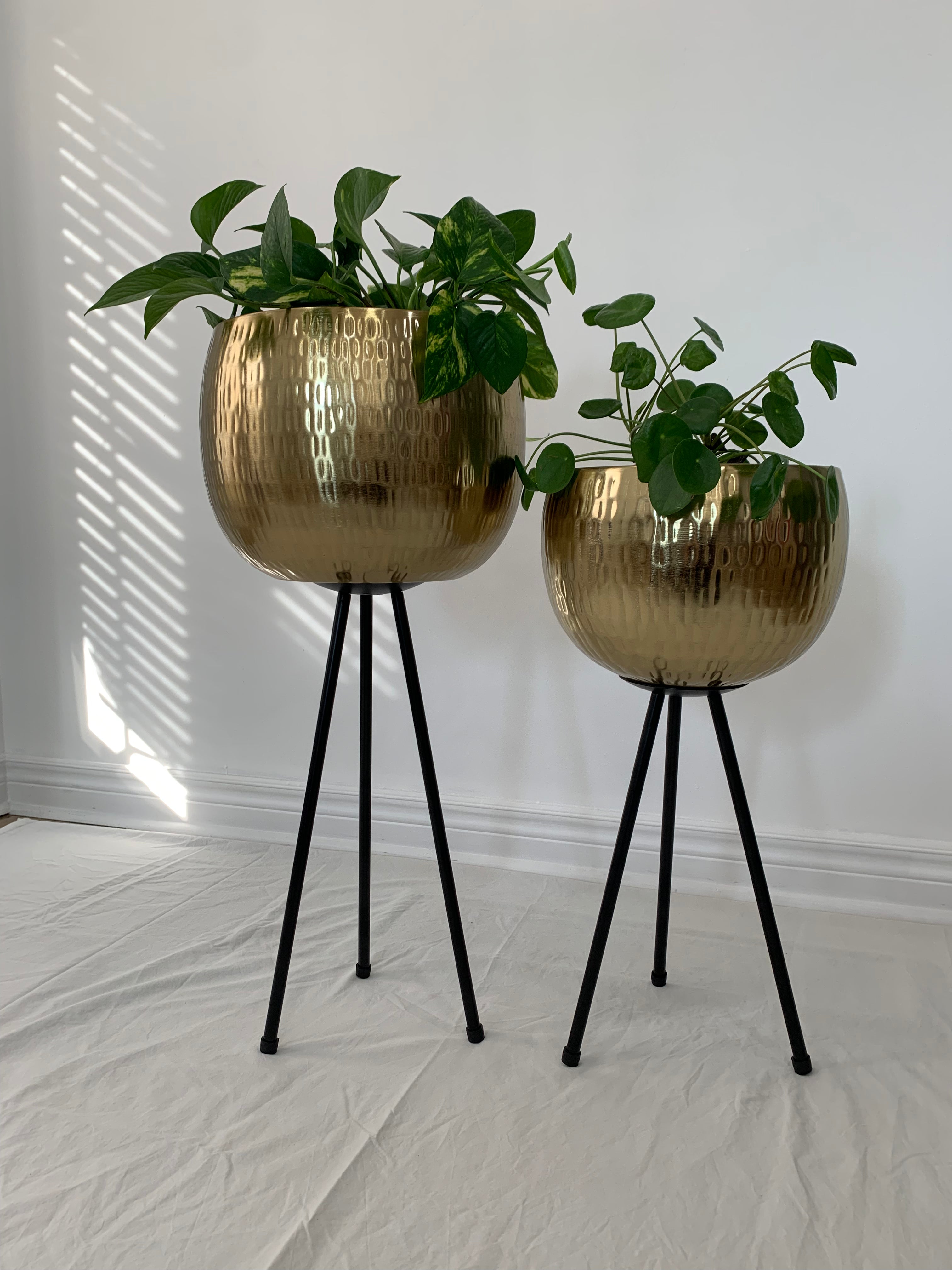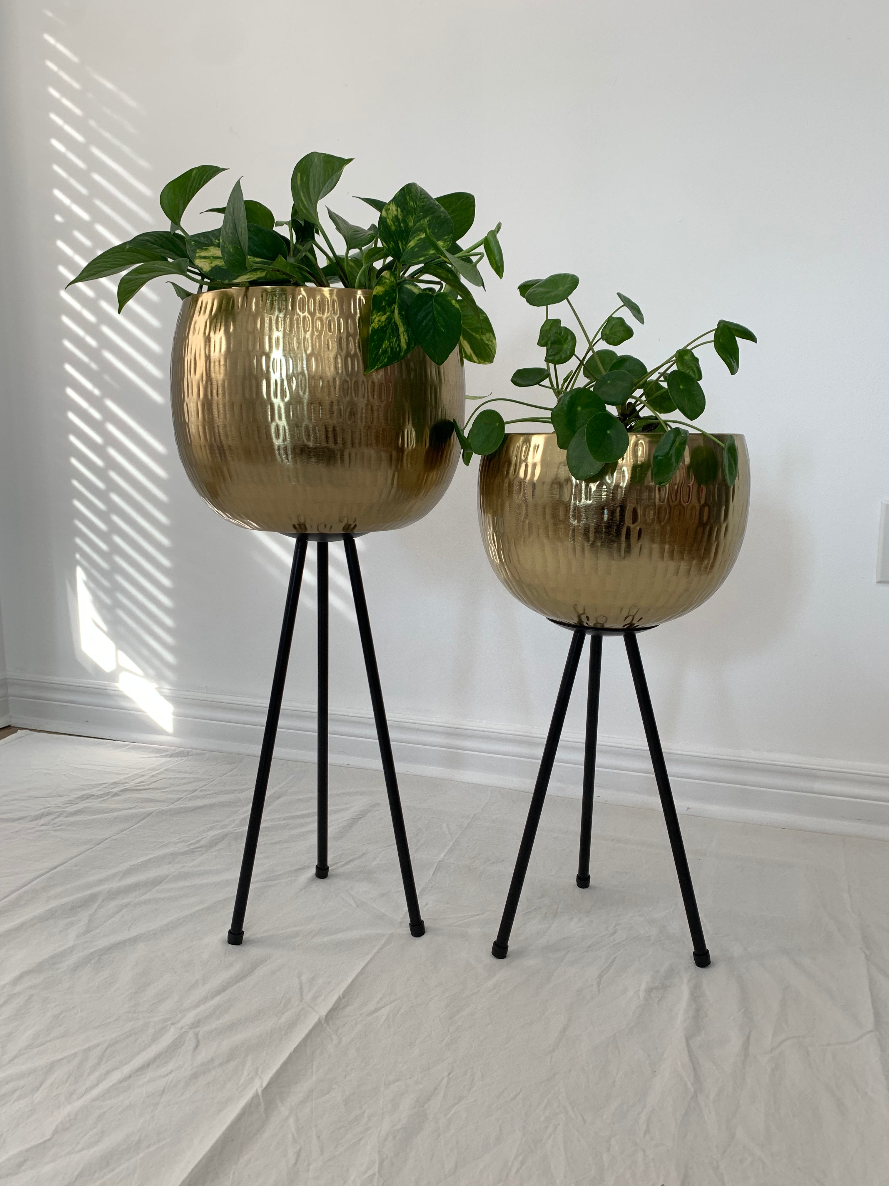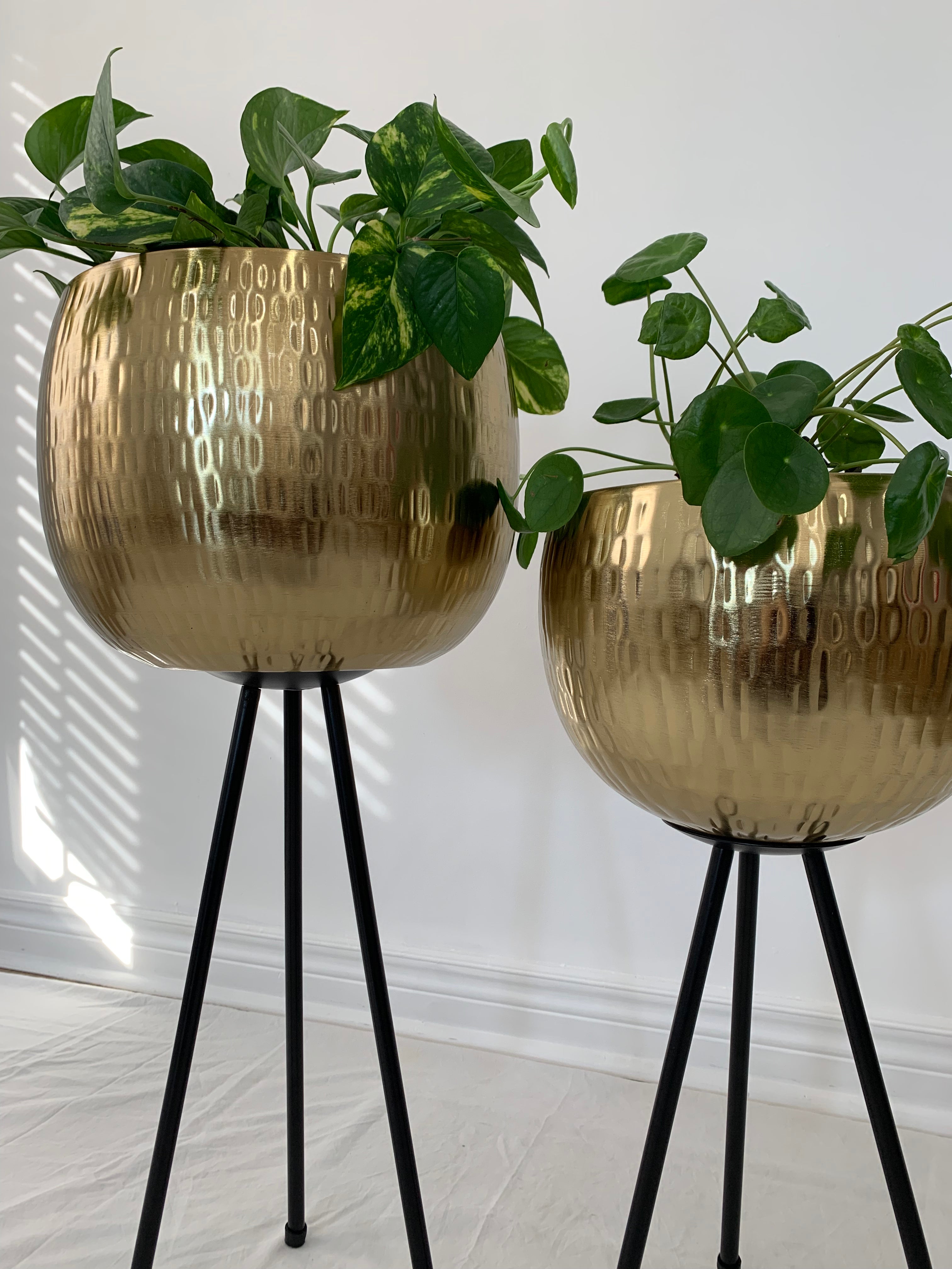 Gold Hammered Metal Bowl Planters on Black Iron Legs