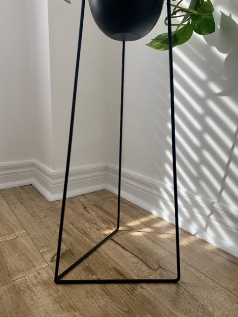 Designed in a distinct sculptural silhouette, this black metal planter is detailed with slim legs and has a raw, matte finish. Complement the smooth texture and display this piece with dried flowers or small plants.